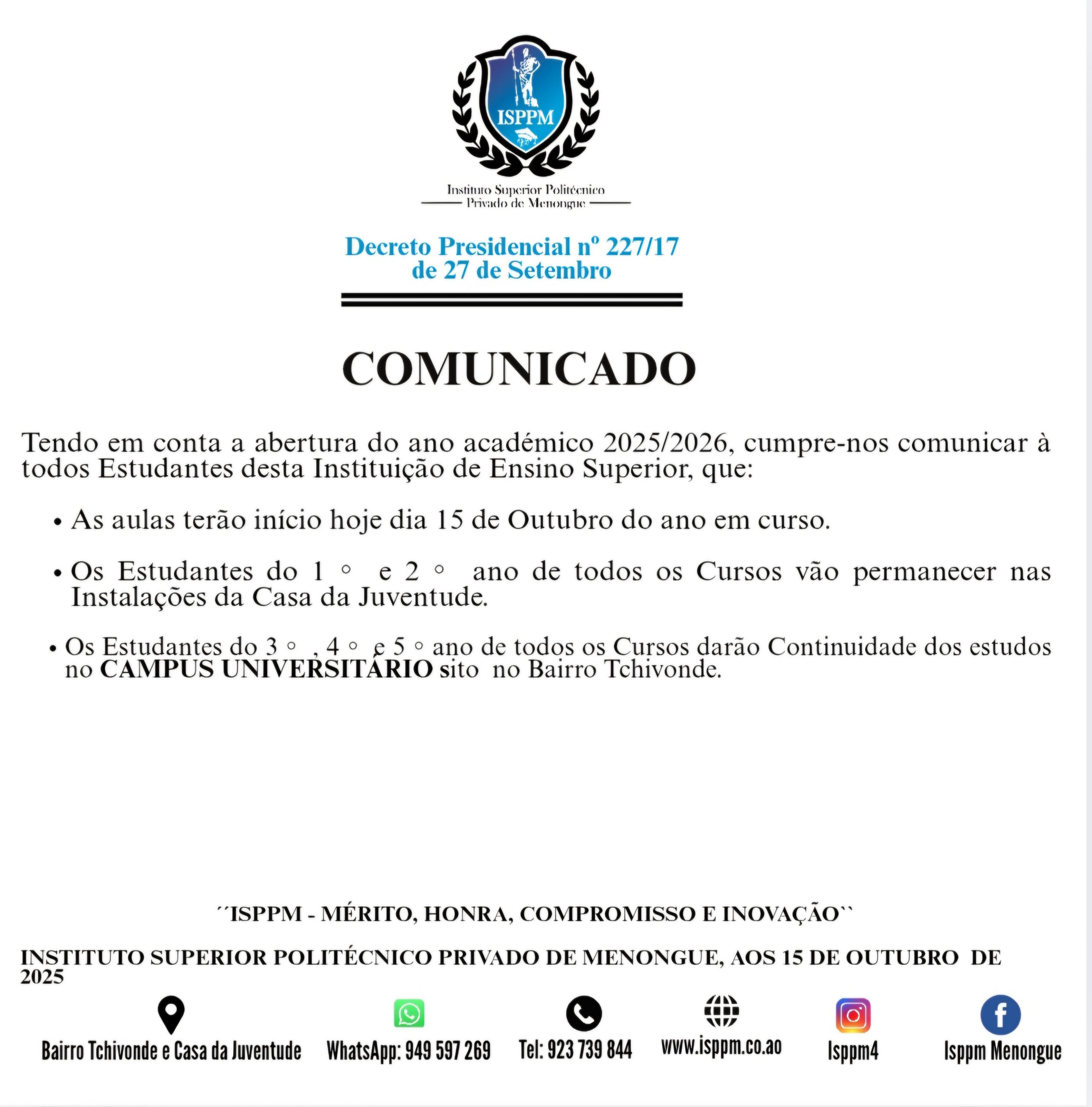By Luzia Gaspar LuziaPosted on 15 de Outubro, 2025Posted in Sem categoriaNo Comments on COMUNICADO SOBRE O REGRESSO ÀS AULAS . COMUNICADO SOBRE O REGRESSO ÀS AULAS . Navegação de artigos 𝐈𝐒𝐏𝐏𝐌 𝐀𝐁𝐑𝐄 𝐀𝐍𝐎 𝐀𝐂𝐀𝐃É𝐌𝐈𝐂𝐎 𝟐𝟎𝟐𝟓/𝟐𝟎𝟐𝟔::::: Deixe uma resposta Cancelar respostaO seu endereço de email não será publicado. Campos obrigatórios marcados com *Comentário * Nome * Email * Site Guardar o meu nome, email e site neste navegador para a próxima vez que eu comentar.