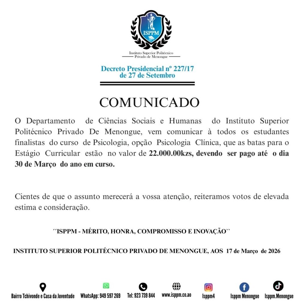 By Luzia Gaspar LuziaPosted on 17 de Março, 2026Posted in Sem categoriaNo Comments on COMUNICADO SOBRE AS BATAS ACADÉMICAS DOS ESTUDANTES DO CURSO DE PSICOLOGIA, OPÇÃO PSICOLOGIA CLÍNICA. COMUNICADO SOBRE AS BATAS ACADÉMICAS DOS ESTUDANTES DO CURSO DE PSICOLOGIA, OPÇÃO PSICOLOGIA CLÍNICA. Navegação de artigos COMUNICADO SOBRE EXAMES ESPECIAIS.𝐌𝐄𝐌𝐁𝐑𝐎𝐒 𝐃𝐎 𝐂𝐎𝐍𝐒𝐄𝐋𝐇𝐎 𝐂𝐈𝐄𝐍𝐓Í𝐅𝐈𝐂𝐎 𝐑𝐄Ú𝐍𝐄𝐌 𝐏𝐀𝐑𝐀 𝐀𝐏𝐑𝐄𝐂𝐈𝐀ÇÃ𝐎 𝐄 𝐀𝐏𝐑𝐎𝐕𝐀ÇÃ𝐎 𝐃𝐄 𝐑𝐄𝐆𝐔𝐋𝐀𝐌𝐄𝐍𝐓𝐎𝐒 𝐃𝐄 Á𝐑𝐄𝐀𝐒, 𝐄 𝐒𝐄𝐑𝐕𝐈Ç𝐎𝐒 𝐍𝐎 𝐈𝐒𝐏𝐏𝐌 Deixe uma resposta Cancelar respostaO seu endereço de email não será publicado. Campos obrigatórios marcados com *Comentário * Nome * Email * Site Guardar o meu nome, email e site neste navegador para a próxima vez que eu comentar.