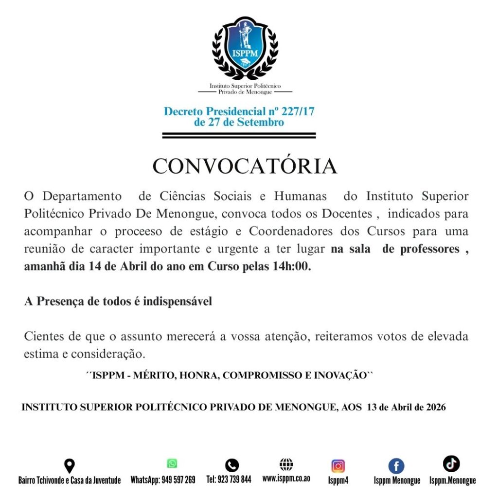 By Luzia Gaspar LuziaPosted on 13 de Abril, 2026Posted in Sem categoriaNo Comments on COMUNICADO PARA TODOS OS DOCENTES E COORDENADORES DOS CURSOS. COMUNICADO PARA TODOS OS DOCENTES E COORDENADORES DOS CURSOS. Navegação de artigos CONVOCATÓRIA PARA TODOS ESTUDANTES FINALISTAS. Deixe uma resposta Cancelar respostaO seu endereço de email não será publicado. Campos obrigatórios marcados com *Comentário * Nome * Email * Site Guardar o meu nome, email e site neste navegador para a próxima vez que eu comentar.
